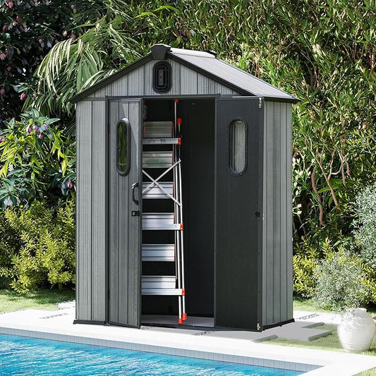 Domi 5x3 FT Outdoor Resin Storage Shed, All-Weather Double-Wall Storage Building for Backyard, Garden, Lawn Tools, Mower, Bike & Pool Equipment, Lockable Doors, Ventilated Roof, Grey