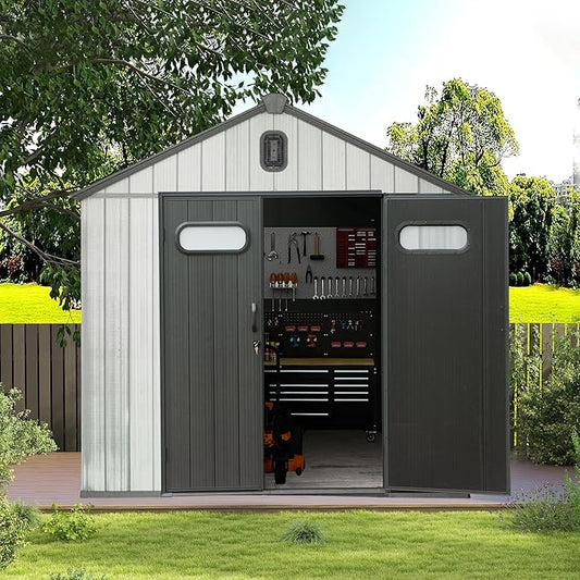 Domi 8x6 FT Outdoor Resin Storage Shed, All-Weather Double-Wall Storage Building for Backyard, Garden, Lawn Tools, Mower, Bike & Pool Equipment, Lockable Doors, Ventilated Roof, Grey