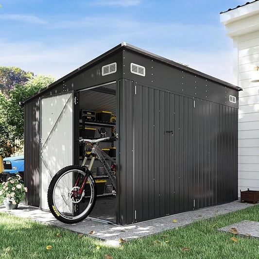 Aoxun 9.5'x7.5' Triple Door Shed Outdoor Storage Shed with Three Lockable Door for Easily Accessing Metal Storage Cabinet with Slopping Roof for Tools Bicycles Storage for Garden, Backyards (Black)