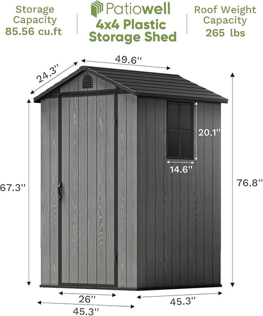 Patiowell 4 x 4 FT Plastic Outdoor Storage Shed with Floor, Garden Tool Shed with Two Windows and Single Lockable Door for Garden, Backyard, Lawn, Easy to Install, Dark Grey(Fit-it Shed)