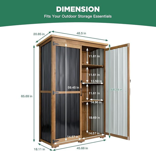 Outdoor Storage Cabinet, Wood & Metal Storage Shed with Weather-Resistant Roof, Double Lockable Doors, Removable Shelves & Adjustable Feet, for Patio, Backyard, Poolside, 46" x 18" x 68"