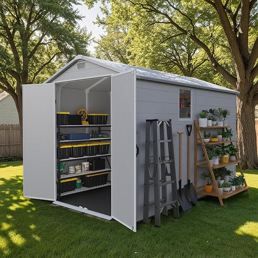 Patiowell 6 x 10 FT Plastic Outdoor Storage Shed with Floor, Resin Outside Tool Shed with Two Windows and Lockable Door for Garden, Backyard, Tool Storage Use, Easy to Install, Light Grey
