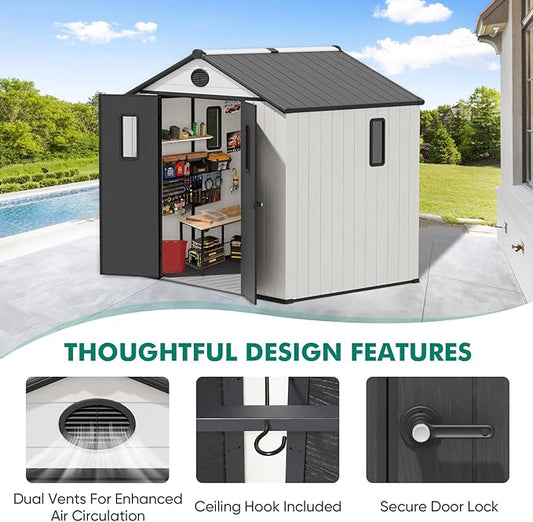 8x8 Resin Outdoor Storage Shed with Floor, Plastic Tool Shed for Gardening, Patio, and Deck, White/Gray