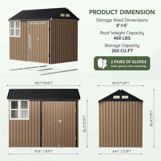 8x6 FT Outdoor Metal Storage Shed with Floor Frame, Double Doors, 1 Clear Window, Tool Shed for Garden, Patio, Backyard Brown