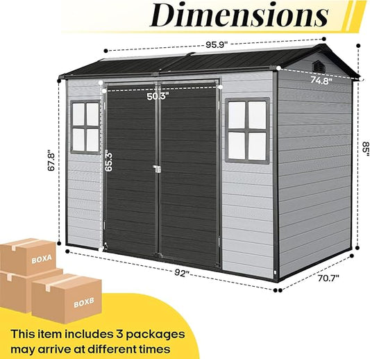 8x6 FT Resin Storage Sheds Outdoor with Floor Included, Plastic Sheds & Outdoor Storage Clearance with 2 Windows and Lockable Door, Backyard Storage Sheds for Bike, Garden Tools, Black+Grey