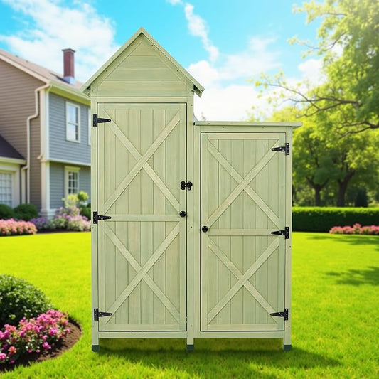 Outdoor Storage Cabinet - Waterproof Metal Roof & Wooden Vertical Design, Tall Garden Tool Shed with Multiple Shelves for Patio, Backyard, Lawn, Yard (Green, 22" x 46" x 67")
