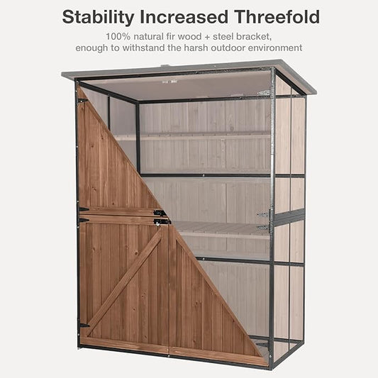 Outdoor Storage Shed with Floor - Waterproof Natural Fir Cabinet with Adjustable Shelves and Double Lock for Anti-Theft - Suitable for Storing Garden Tools, and Household Debris (Deep Brown)
