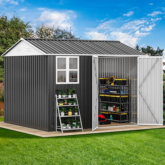 DWVO 10x8ft Large Tool Storage Shed with Window, Lockable Doors, and Sloped Roof, Oversized Steel Outdoor Storage Shed for Garden, Patio, Garage, Backyard, Lawn - Gray & White