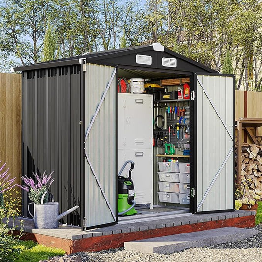6x4 FT Outdoor Storage Shed with Base, Metal Garden Tool Shed with Sloping Roof & Lockable Door for Patio Lawn Backyard (Black with Base)