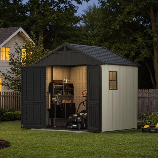 Patiowell 8 x 6 FT Resin Outdoor Storage Shed with Floor, Large Shed with Light and Lockable Door for Garden, Backyard, Tool Storage Use, Easy to Install in Beige (Kick-it Shed)