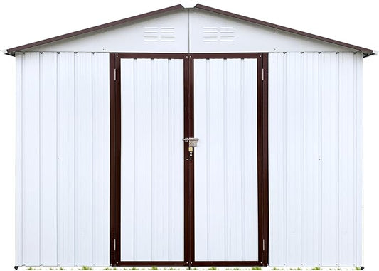 Storage Shed 8ft×6ft Classic Apex Roof Tool Shed Outdoor Storage Metal Garden Storage Sheds Tool Cabinet with Hinged Door Syste for Backyard, Patio, Poolside, White +Offee