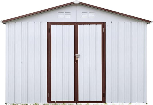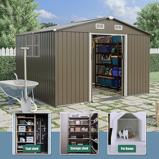 10x10 FT Metal Outdoor Storage Shed, Dual Doors with Lockable Bolts, Large Garden Shed for Yard Tools, Bike, Generator, Waterproof Galvanized Steel Panel with Vent & Sloping Roof (Brown)