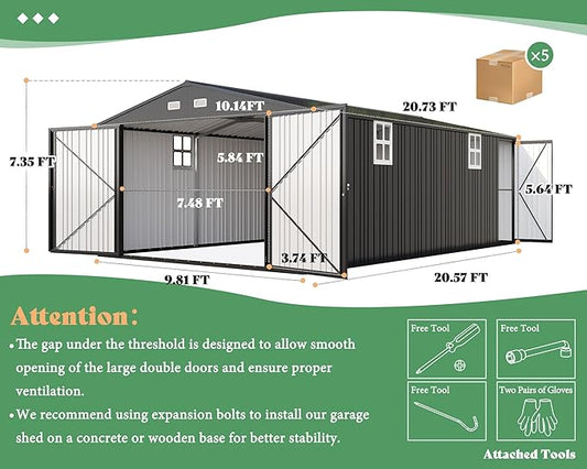 AMERLIFE 10x21x7.3 FT Outdoor Metal Garage Shed, Extra Large Storage Shed with Double Hinged Doors, 4 Windows, Carport for Car, Midsize SUV and Lawn Equipment, Dark Gray