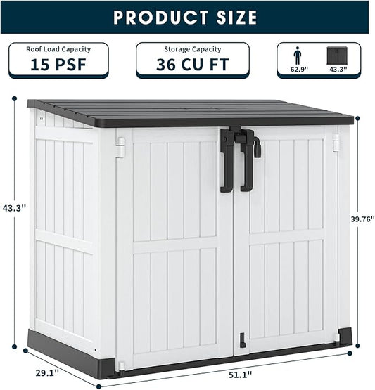 Outdoor Storage Shed 36 Cu. Ft. Resin Garden Horizontal Storage Large Capacity Weather Resistant Storage Box, Lockable Resin Waterproof Shed for Garbage Cans, Garden Tools