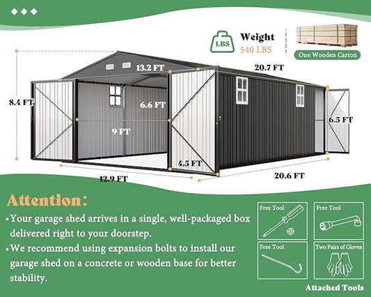 AMERLIFE 13x21x8.4 FT Outdoor Metal Garage Shed, Extra Large Storage Shed with Double Hinged Doors, 4 Windows, Carport for Car, Truck, Bicycle and Lawn Equipment, Dark Gray