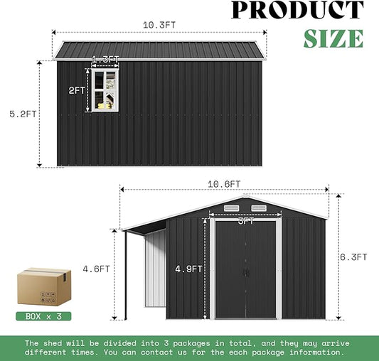Jocisland Outdoor Storage Shed 10.6x10.3x6.3 FT, Sliding Door Shed with Two 4-Pane Windows for Wood Storage, Dark Grey/White