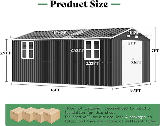AMERLIFE 10x16x7.2 FT Metal Storage Shed with 2 Transparent Panels, Outdoor Tool Shed with Hinged Double Doors, Windows & Vents, Reinforced Steel Frame for Backyard Garden, DIY Workshop, Dark Gray