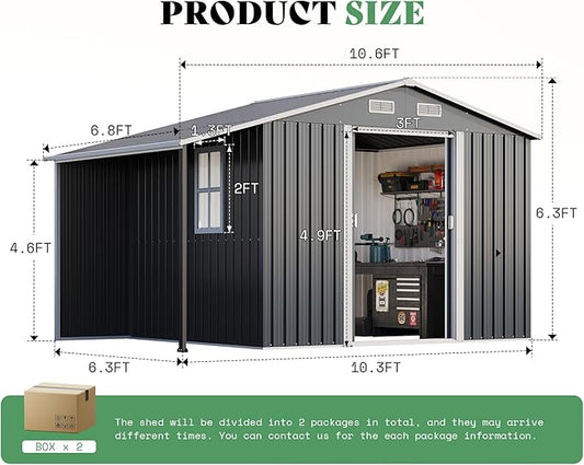 Jocisland 10.6x6.8x6.3 FT Outdoor Storage Shed with Sliding Doors, Two 4-Pane Windows, Open Design Outdoor Shed for Wood Storage, Dark Grey/White