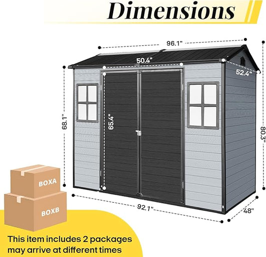 8x4ft Resin Outdoor Storage Shed with Floor and 2 Windows, Plastic Sheds & Outdoor Storage Clearance for Patio Furniture,GardenTools, Bike Accessories and Lawn Mower