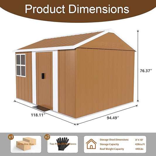 10x8 FT Outdoor Steel Storage Shed with Clear Windows, Sliding Lockable Door & Ventilation, Brown and White Weather-Resistant Metal Tool Shed for Garden, Backyard, Lawn, and Utility Storage