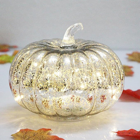 Mercury Glass Pumpkin Lights with Timer, Battery Operated Led Pumpkin Lights for Halloween Fall,Thanksgiving Rustic Decor (Silver Common, 8")