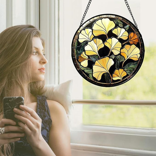 Stained Glass Window Hanging - Ginkgo Leaf Suncatcher for Doors Garden Patio Retro Fall Decor Sun Catchers Christmas Mother's Day Birthday Gifts for Women Men Mom Nana Friend 9.8 in