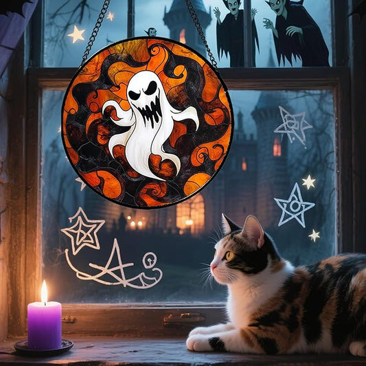 Stained Glass Window Hanging - Halloween White Ghost Suncatcher for Doors Window Garden Indoor Spooky Funny Orange Sun Catchers Gothic Decor Horror Gifts for Women Men Friend 11.8 in