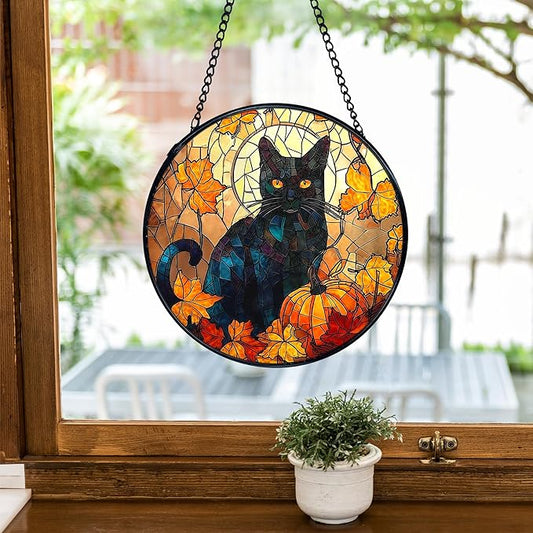 TNUW Fall Pumpkin Black Cat Stained Glass Window Hanging, Autumn Pumpkin Maple Leaf Black Cat Sun Catchers Indoor Window Glass Round Wall Art Decor, Rustic Fall Wall Hanging Decorations, 7.9"x7.9"