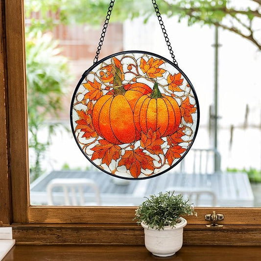 TNUW Fall Autumn Pumpkin Stained Glass Window Hanging, Farmhouse Autumn Pumpkin Maple Leaf Sun Catchers Indoor Window Glass Round Wall Art Decor, Rustic Fall Wall Hanging Decorations, 7.9"x7.9"