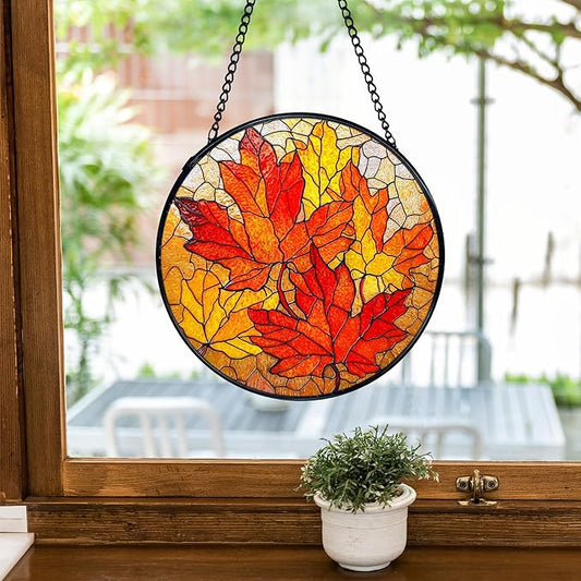 TNUW Fall Leaf Stained Glass Window Hanging, Rustic Autumn Maple Leaves Sun Catchers Indoor Window Glass Round Wall Art Decor, Fall Autumn Wall Hanging Decorations, 7.9"x7.9"