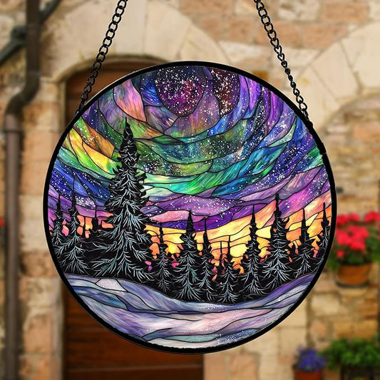 Stained Glass Window Hanging, Aurora Landscape Sun Catchers Glass Panel Green Trees Suncatcher Decor for Birthday for Women, Men, Wife, Aunt, and Mom 14.9x14.9 in