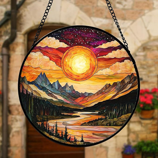 Stained Glass Window Hanging, Dusk Sunset Landscape Sun Catchers Glass Panel Lakes and Mountains Suncatcher Decor for Birthday for Women, Men, Wife, Aunt, and Mom 11.8x11.8 in