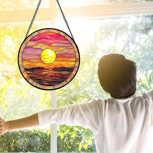 Stained Glass Window Hanging, Sunrise Sea Surface Sun Catchers Diamond Glass Panel Hangings Abstract Suncatcher Decor for Birthday for Women, Men, Wife, Aunt, and Mom 9.8 in