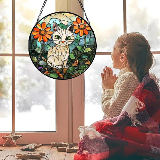 Stained Glass Window Hanging - White Cat Green Plants Orange Flowers Sun Catcher for Door Garden Home Decor Suncatcher Christmas Mother's Day Birthday Gifts for Women Men Mom Nana 7.8 in
