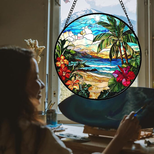 Stained Glass Window Hanging, Blue Beach Scenery Suncatcher Diamond Glass Panel Hangings Sun Catchers Decor for Birthday for Women, Men, Wife, Aunt, and Mom 14.9x14.9 in