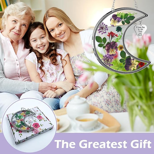 KY&BOSAM Moon Suncatcher I Love You to The Moon and Back Stained Glass for Window Hangings Wind Chime Decor with Pressed Real Flower and Metal Charm Birthday Gift for Women Mom Mother`s Day Christmas