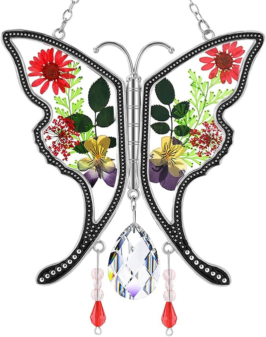 KY&BOSAM Gifts for Mom Crystal Butterfy Suncatcher Stained Glass Butterfly Suncatchers for Windows with Pressed Real Flowers Heart Charm Engraved with Crystal Mother`s Day Birthday