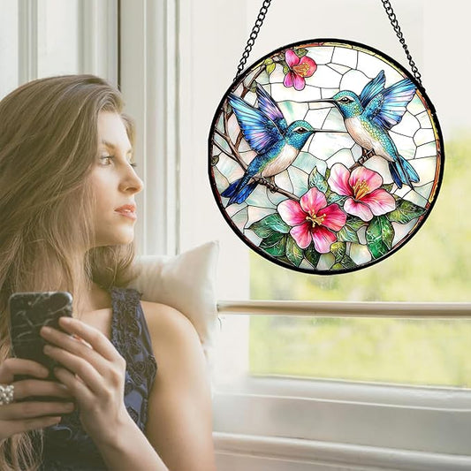 Stained Glass Window Hanging - Blue White Hummingbirds Pink Flowers Suncatcher for Door Terrace Garden Home Decor Bird Sun Catcher Birthday Gifts for Lovers Women Men Dad Mom Nana 9.8 in