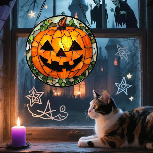 Stained Glass Window Hanging, Halloween Decorations Evil Pumpkin Suncatcher for Doors Garden Indoor Spooky Funny Orange Sun Catchers Gothic Decor Horror Gifts for Women Men Friend 9.8 in