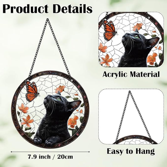 Black Cat Sun Catcher - Black Cat Butterfly Flower Suncatcher Rainbow Maker Stained Acrylic Window Hanging Ornament Indoor Outdoor Decoration Home Garden Decor Chain Pendant Memorial Gifts