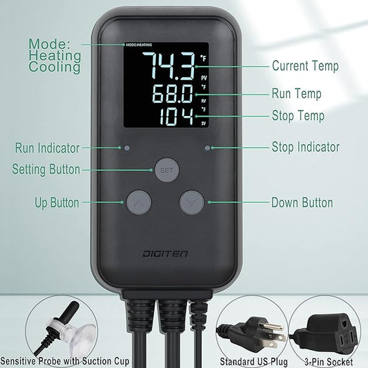 DIGITEN DTC151 Temperature Controller Plug-in Thermostat Cooling Heating Temperature Controller Outlet GreenhouseThermostat for Germination Incubation Homebrewing