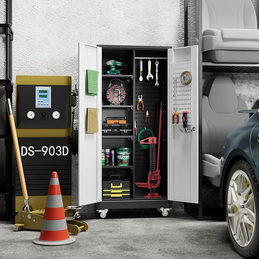 Garage Storage Cabinet with 5 Adjustable Shelves and Door Pegboard,Metal Storage Cabinet with Wheels for Garage Home,Required Assembly,Black, 71" H×32" W×16" D