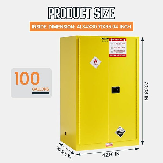 SPECRAFT 100 Gal Flammable Safety Cabinet, 70x43x34 Inch, Cold-Rolled Steel, Adjustable Shelves, OSHA & CE Certified for Industrial, Commercial, Laboratory, and Institutional Use, Yellow