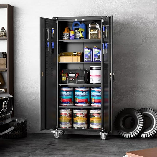 Metal Garage Storage Cabinet with Wheels and Pegboard, 72" H Rolling Steel Storage Cabinet with 4 Adjustable Shelves and Lockable Door for Garage, Office, Home,Required Assembly,Black
