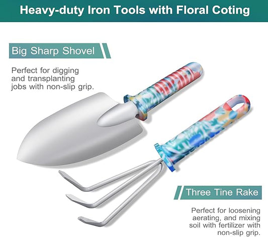 Garden Tool Set, Stainless Steel Heavy Duty Gardening Tools 30 PCS w/Floral Print, Trowel Rake Weeder Pruner Shears Sprayer Digging Claw Gloves, Ideal Gardening Set for Women