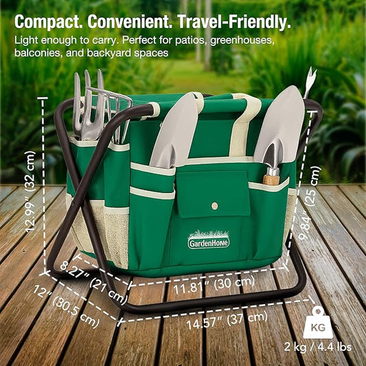 GardenHOME 7-Piece Gardening Tool Set – Stainless Steel Hand Tools with Wooden Handles, Folding Stool, and Canvas Tote Bag, Yard Maintenance Kit for Gardeners, Women, and Beginners