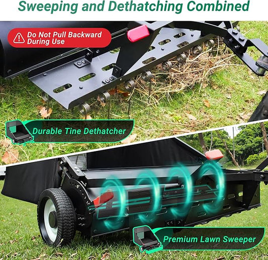 Suchtale 42" Tow Behind Lawn Sweeper with Dethatcher – 21 Cu. Ft. Leaf Collector with Adjustable Sweeping Height, Large Hamper Windscreen for Lawn, Yard, & Artificial Grass, Tractor/Mower Attachments