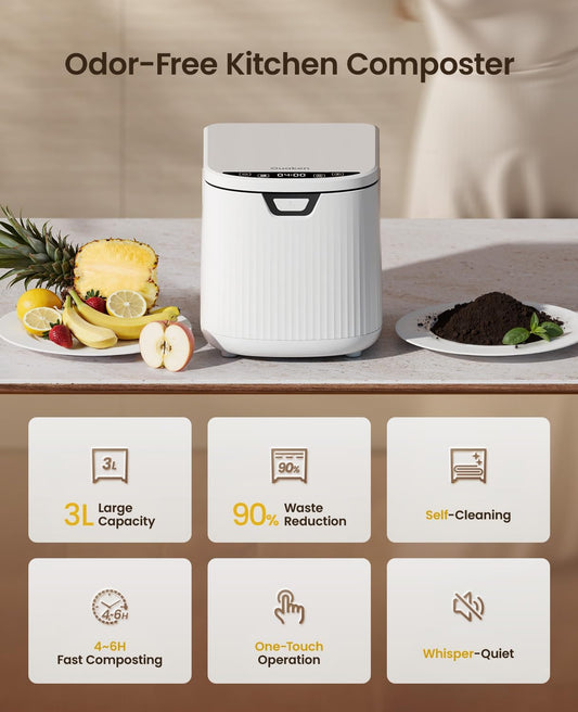 3L Electric Composter for Home, Kitchen Compost Bin for Countertop, Odorless/Auto-Clean/LED Display, One-Touch Composting to Handle Daily Household Food Waste.