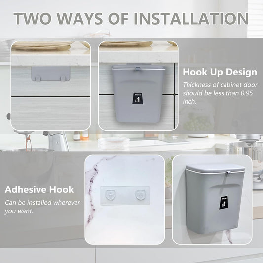 Hanging Trash Can with Lid, 2.3 Gallon Kitchen Garbage Bin Food Waste Container Convenient Durable Over Cabinet Door RV Counter Camping Cupboard Under Sink Compost Bathroom Wall Mounted