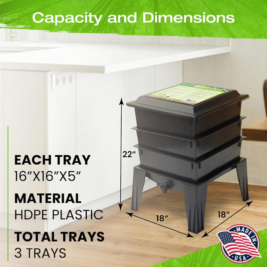 Worm Factory® Basic 3 Tray Black Worm Composter – US Made, Fully Assembled System for Home Food Waste Recycling – Includes Accessories for Odor-Free Vermicomposting – Durable, Space-Efficient Design.